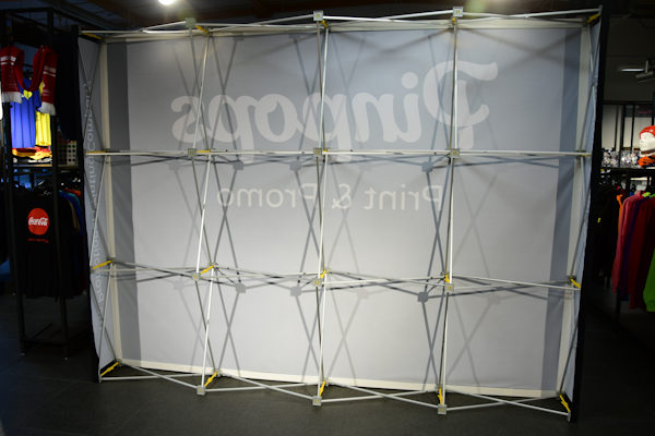 Följ instruktionerna noga; ramen kan skadas om man använder för mycket kraft. Vid korrekt användning håller mässväggen i många år, och du kan enkelt beställa ett nytt tygtryck när du vill förnya ditt budskap utan att behöva byta ut själva ställningen.
