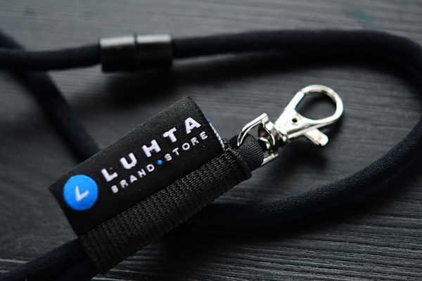 Längst ner på bandet, precis ovanför nyckelringen eller karbinhaken, kan vi fästa ett vävt märke med din logotyp eller text.